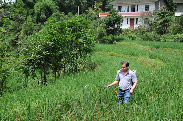 上午11:20,在二一村4組張代富家的農田里,機關黨員卷起褲腿,背上噴霧器,向田間的水稻施藥。“今年雨水太多,蟲口大,稻瘟病嚴重。今天剛好天晴,正是施藥的好時機。”張代富在旁邊向大家介紹情況,還不時地教大家施藥的方法。雖然烈日當頭,谷苗刺腿,但大家仍然舞動噴頭在田間勞作,體驗農耕生活。